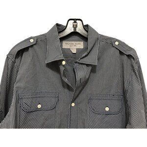 Men's Michael Kors Blue White Small Check Cotton Military Long Sleeve Shirt Size