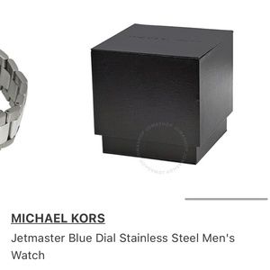 Stainless steel case with a stainless steel bracelet. Uni-directional rotating stainless steel bezel with black top ring. Blue dial with luminous silver-tone hands and index / Roman numeral hour markers. 24 hour around the outer rim. Dial Type: Analog. Luminescent hands and markers. Date display at the 12 o'clock position. 12 hour sub-dial at the 6 o'clock position. Quartz movement. Scratch resistant mineral crystal. Screw down crown. Solid case back. Round case shape. Case size: 45 mm. Case thickness: 11 mm. Band width: 20 mm. Band length: 7.85 inches. Deployment clasp. Water resistant at 100 meters / 330 feet. Functions: date, hour, minute, second. Casual watch style. Michael Kors Jetmaster Blue Dial Stainless Steel Men's Watch MK8400.