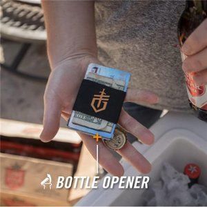 The GERBER bar bill wallet has a slim profile that securely holds up to 7 cards within the flexible elastic band. The wallet's heavy duty, yet lightweight frame contains a built in bottle opener.