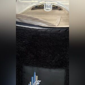 Inside zipper faux fur lining, inside zipper pocket, rain stain repellent, belted.