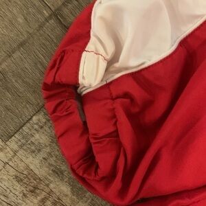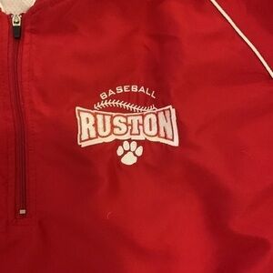 This men's Mizuno jacket is perfect for those chilly and windy baseball nights. 100% polyester, this jacket has a mid zipper and elastic pull waist. This red and white Mizuno jacket has been monogrammed to represent the Ruston Baseball program on the left chest. The top back of the jacket has breathable netting as well.