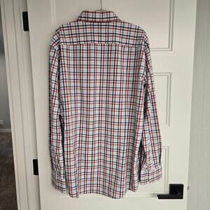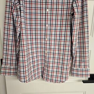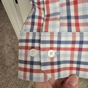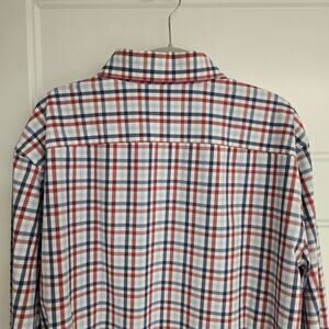 Excellent condition, men's Mizzen + Main Leeward red and blue, long sleeve, button down, dress shirt. This material is lightweight and does stretch.