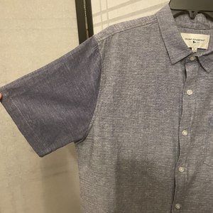 Men's Modern Amusement short sleeve button-down shirt. Shirt is a grey-blue with dark grey-blue sleeves. Has a pocket at the front. Never worn and in great condition. Size Men's Large.