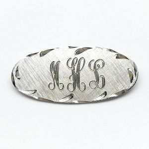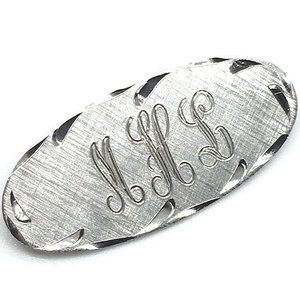 Vintage sterling silver lapel pin or brooch. Oval design w/ florentine etched background & diamond cut border, monogrammed w/ initials M H L . Unisex in style, wear on a lapel, tie, hat, shirt, or whatever you can stick a pin through.. Within reason lol 😉