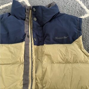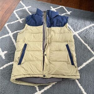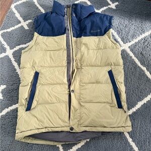 Beige puffer vest with navy shoulders. Features front pockets and a high collar. Ideal for outdoor adventures. In great condition. Barely worn.
