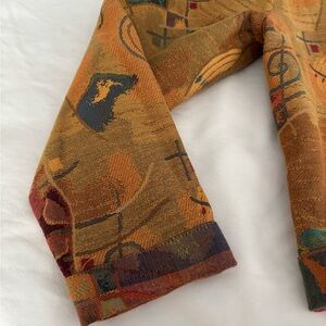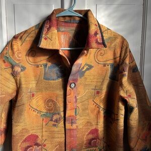 Lightweight woven tapestry spring jacket by I believe to be Winding River. Features a tribal-inspired design in rich tones of green, blue, red, and gold, set against warm brown hues. Reversible blazer-style design with attractive buttons on both sides, allowing it to be worn either way for two distinct looks. In excellent, like-new condition. Tags were removed prior to wear and are no longer attached. No sizing on the jacket, but I’ve included measurements. I believe it to be a small medium.