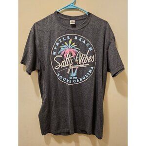 Men's Fruit of the Loom Myrtle Beach Salty Vibes T Shirt SIZE M GREY W/NEON PINK BLUE PRINT.  50% Cotton 50% Polyester. Laid flat measures 19.5" armpit  to armpit and 28" from top of shoulder to bottom hem.