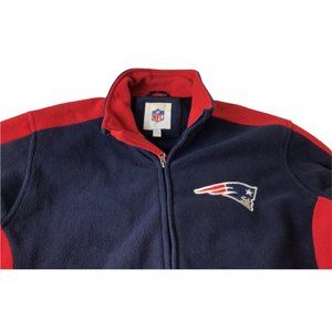Nice long sleeve red & blue fleece Full zip sweatshirt that has embroidered Patriots logo on the front. It has a full zip front and side pockets. It is a soft fleece with long sleeves. Thick and warm jacket. Please ask any questions.
