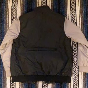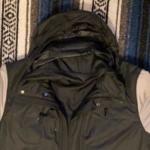 Black with cream sleeves, large pocket on back for extra storage, 2 pockets on the front, collar has zipper with hood inside to hide, drawstrings around neck, with both zipper and snaps to close the front. Very warm, thicker than just a rain jacket!!!