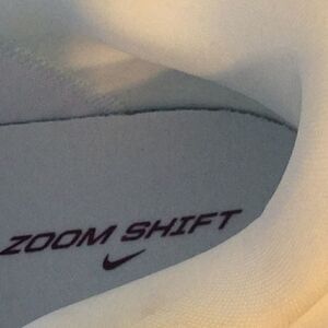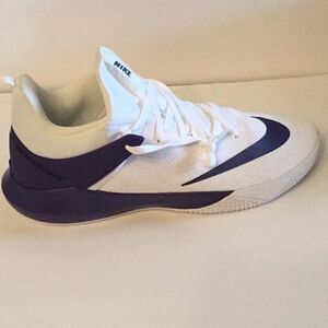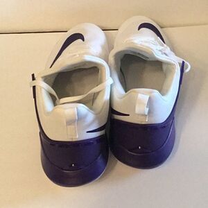 White uppers with a dark purple NIKE logo & purple at heels. New with out tags, no box.