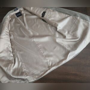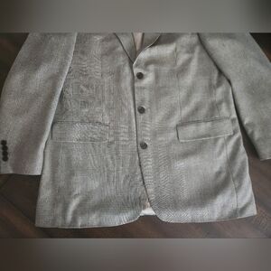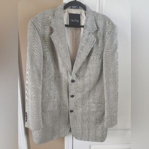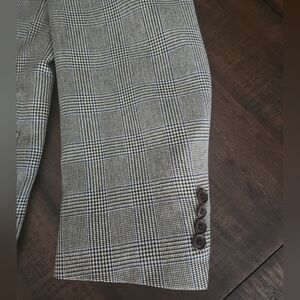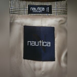 Classy cream, blue, and black houndstooth suit jacket by Nautica. 42L. No flaws. All buttons anchored well. Gorgeous tan inner lining. Long jacket. Silk and wool.