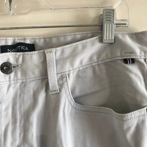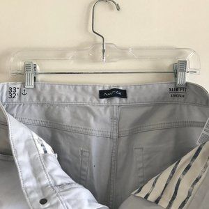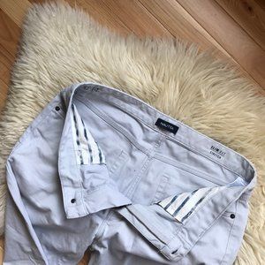 Mens Nautica Light Grey Slim Fit Pants. These are a very pale / light grey color. In very good pre-owned condition with some wear, but no noticeable flaws.