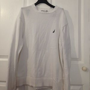 White mens sweater. Pair it with collared lonsleeves or wear it as is. Small stain in the front only. Nice sweater. Need ironing. Buy this men’s sweater and get a free bracelet!