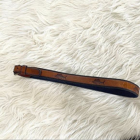 Men’s Navy Blue Brown Marlin Fish Print Solid Brass Belt 43” Length