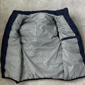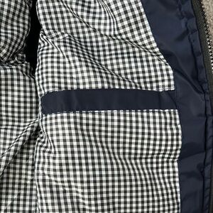 This blue quilted puffer vest features a stand-up collar and a full-length zipper for a secure fit. The horizontal stitching adds a stylish touch while providing warmth, making it perfect for outdoor wear. The outer shell has a slight sheen, indicating a water-resistant fabric suitable for various weather conditions. Comes from a smoke/pet free home.