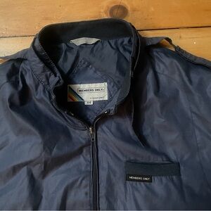 The Vintage Members Only Jacket in Men's Size 44 features a navy blue distressed design, perfect for a casual or travel occasion. Made from polyester with a softshell fabric type, this bomber jacket has a zipper and snap closure with stand-up collar and logo accents. The lightweight jacket offers full zip, pockets, and is machine washable, making it ideal for winter, fall, and spring seasons. With its 80s theme and iconic Members Only brand, this classic fit jacket is a stylish and versatile addition to any man's wardrobe.