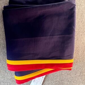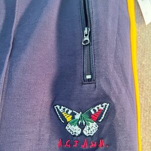Comfortable navy joggers featuring vibrant red and yellow side stripes. Ideal for everyday wear or workouts. Very plush