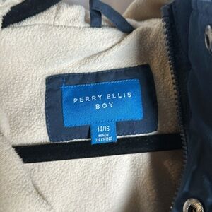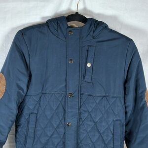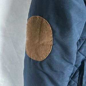 Stay warm and stylish with this navy quilted jacket featuring brown elbow patches. Perfect for any casual outing.