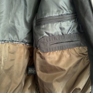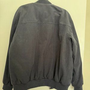 Excellent condition, only worn once. Navy brushed polyester sueded microfiber shell, with polyester lining and fiberfill. Rounded elastic collar and elastic waistband/cuffs. 2 outer slit pockets. 3 pockets on the inside--2 slit/open, and 1 slit/zippered.