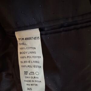 * Notched lapel * Two-button closure; four-button cuffs * Two front flap pockets, left chest welt pocket * Attached adjustable pocket stuffer * Side vents; fully lined