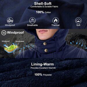 Material:Outer Fabric:100% Cotton,Fleece Lining:100% Polyester,Soft and Thick Fleece Lining adds insulation to make us more comfortable,Front Buttons with leather Closure and Front full Zipper Closure,Elastic cuffs,effective wind protection,Let this winter jacket succeeded.