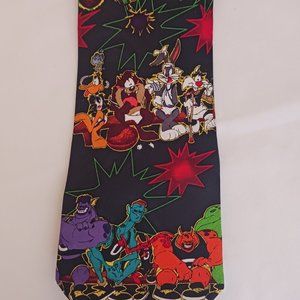 Vintage men's necktie, Bugs Bunny and crew, Space Jam. 100% polyester, made in Korea, Dry Clean Only tag. Looney Tunes Mania, Warner Brothers copyright 1996, about 59 inches in length total, 4 inches wide at widest point. Pre-owned item in good condition, no holes, no tears, no stains