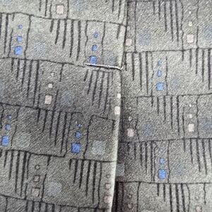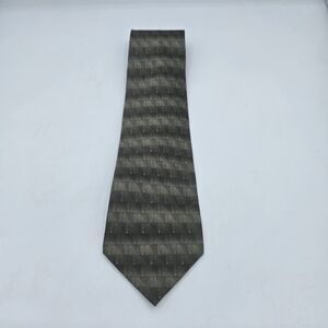 This vintage men's necktie features a black and brown striped design, with a geometric pattern and pointed style. Made from polyester with a silk fabric type, this tie is 57 inches long and 4 inches wide. It is designed for formal occasions, with a business character and layered logo accents. Perfect for adding a touch of elegance to a suit, this multicolored tie is a stylish accessory for any man's collection. Made in Korea, Republic of.