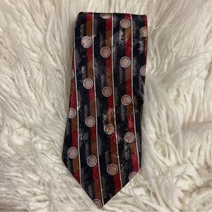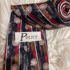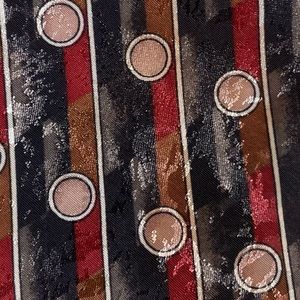This is a metallic fun necktie by Policy. In good used condition. The pattern is stripes and circles. The colors: red copper silver blue gray. There is no fabric tag.