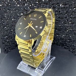 This is an elegantly simple, brand-new, never-worn Bulova men's watch. It has a black face with diamonds at the 3, 6, and 9 o'clock positions and the date at the 3 o'clock position. The rest of the watch is a stunning gold in color