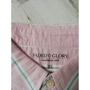 The product is a Men's Faded Glory pink button-up shirt in size 3XL with short sleeves. The shirt features a striped pattern and is designed for big and tall men. With its new old stock status and still attached tags, this shirt offers a stylish and comfortable addition to any casual wardrobe. Perfect for adding a pop of color and a classic touch to any outfit.