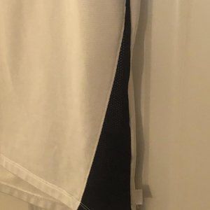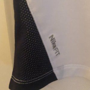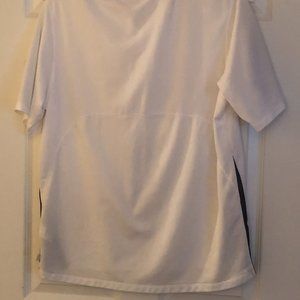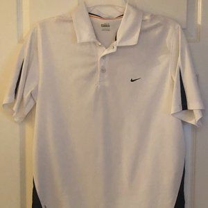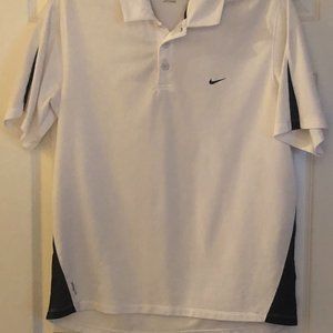 Nike fit golf shirt- to keep you comfortable on and off the course. 100% Polyester. Size Large. Like new with no defects. 3 Button front. Collared with short sleeves. White shirt but has stylish dark blue plague inserts on sides and sleeves.