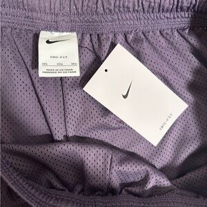 Purple Nike Dri-FIT basketball shorts. These shorts are designed with breathable knit fabric and Nike's Dri-FIT technology to keep the wearer dry and comfortable during physical activity.