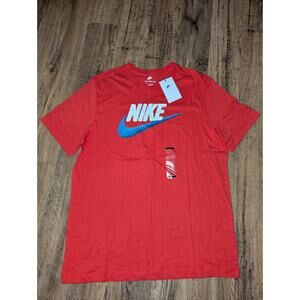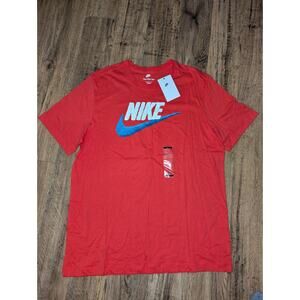 The Men's Nike Futura Tee in size L is a red T-shirt designed for men by the popular brand Nike. Made with a regular fit and featuring the iconic Nike swoosh, this T-shirt is a stylish and comfortable choice for casual wear. Its red color adds a pop of color to any outfit, making it a versatile and on-trend addition to any wardrobe.