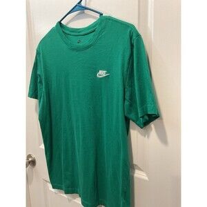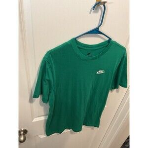 The product is a men's Nike green T-shirt featuring an embroidered logo. It is a medium size shirt with a regular fit, ideal for everyday wear. The green color adds a pop of color to any outfit, and the embroidered logo gives it a classic and high-quality look. Perfect for any Nike enthusiast or someone looking for a stylish and comfortable shirt.