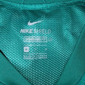 Mens Nike Pullover Size M. Green. Lucky symbols pattern. Long sleeve. Nike Shield, Standard Fit. Wind breaker type material. Style is Ridgemoor Country Club Nike Crew Outer. Chest flat 24", length 26.5", sleeve length 24.5". Good used condition