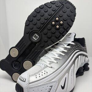 Silver fade on the upper, clean white panels, with black Shox in the back.
