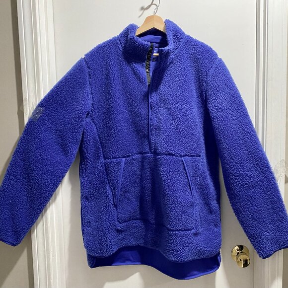 This Men's Nike Yoga Sherpa Fleece Loose Fit Comfort Blue Pullover Bomber Jacket is the perfect blend of style and comfort, ideal for travel and casual occasions. Made from polyester fleece, this mid-length jacket features a stand-up collar, snap closure, and a classic fit. The comfy style and blue color make it versatile for various seasons, from winter to spring. With a logo accent and lined interior, this jacket is a must-have for any man looking for a classic and preppy outerwear option. Excellent used condition. Measurements: pit to pit 24', sleeve 27,5", length on the front 30" and back 34". Check my other listings.