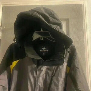 Mens NordicTrack fleece lined jacket with adjustable hood, front zipper also with Velcro closure, two side pockets & two interior pockets. Logo on front. Shell, Lining & filler 100% poly. Men’s size Large. Gray black & yellow. Nice heavy warm jacket SFPF HOME