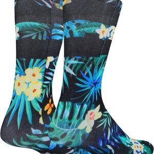 Tropical Leaf Flower Socks Tropical leaf socks, hawaii socks, floral socks. for men. Green palm tree leaves and yellow flower printed on black socks, cool and funky, casual socks suitable for women and men.