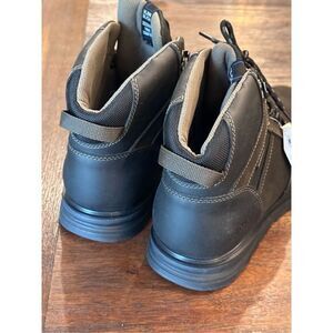 Great shoe/boot for men. Think outdoor on rainy days, active outdoor activities, gardening, or simply a casual go to ankle boot. Waterproof leather upper with lace-up closure, almond toe, comfort gel heel and memory foam insole. Padded lining around ankle for comfort. Sturdy EVA sole. Dark gray in size 12. New!!
