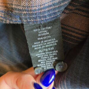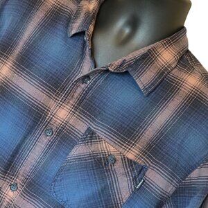 Blue and a peachy orange plaid flannel from O'Neill. Button up with one front pocket. Good pre-owned condition. No rips, holes or tears noted. Size XL