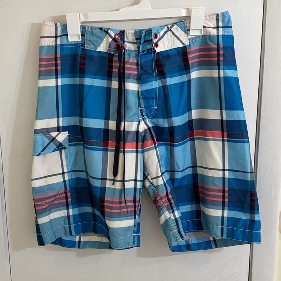 Men's Old Navy 9.5" Board Shorts Medium Plaid Pattern Blue