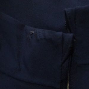 Large, no zipper, slight tear at the collar in one of the pictures. Never worn with no tags