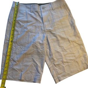 Mens size 31. see pics for more measurements. Zipper and button front closure. 2 side slash pockets. one back button slash pocket. one back button flap pocket. The color is hard to describe so i included a pic of them next to khaki and next to gray. i would call it a very light linen color with a taupe plaid pattern. Hybrid aka amphibian shorts look like regular shorts but are made with board short material so they are quick drying so they go from swim/ surf to casual wear in a jiffy