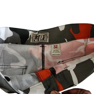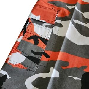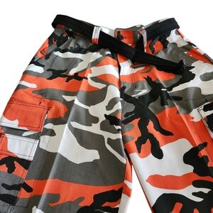 Stand out in these bold urban-style cargo shorts featuring an eye-catching orange, white, and black camo pattern. Designed with multiple utility pockets and a rugged built-in black web belt, these shorts combine fashion and function. Adjustable drawstrings at the hem let you customize the fit for streetwear flair or everyday comfort.