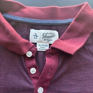 Classic Original Penguin men’s polo shirt in a maroon and navy micro-stripe design. Features a 3-button placket, chest logo embroidery, and contrast collar. Comfortable cotton blend fabric makes it perfect for casual wear, golfing, or weekend outings.
