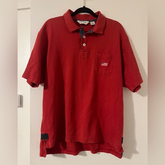 Men’s Orvis Large Red Short Sleeve Polo Shirt American Flag Embroidered- (S107)