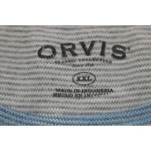 This is a Men's Orvis Sweater that is a size XXL. It's a really nice sweater. It has light blue, gray, and white blended together to make a beautiful color blend. It is very soft and has great quality. In good condition. It is Rayon and Polyester.