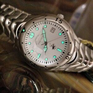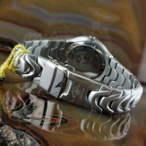 New Old Stock ~ Vintage Mens POLO Windward ALL Solid Stainless Steel Watch Beverly Hills Polo ~ 1980's ~ Fold Over Push Button Double Locking Clasp ~ White Dial ~ 39mm Case ~ Watch will Fit up to an 8" Wrist ~ Unidirectional Rotating Bezel ~ Luminous Hands & Markers ~ 3ATM Water Resistant ~ Date Window at 3:00 ~ Brushed Stainless Steel Band with Polished Steel Accents ~ New Battery Installed ~ Runs Great ~ Hard to Find ~ All Sales Final on Watches ~ No Box ~ Shipped USPS Insured Mail.