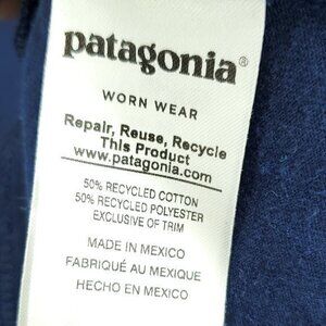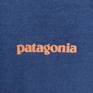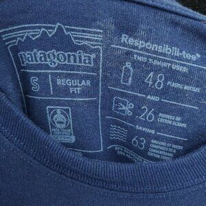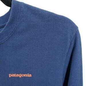 Men's Patagonia Long Sleeve T-Shirt in size S, color Blue with Red Logo at chest and Sleeve Spellout. Good used condition with some overall wear (feels like it's been through the wash a few times vs. brand new), no flaws. Features a crew neckline, ribbed cuff sleeves, fully fashioned shoulders, and logos at chest and sleeve.